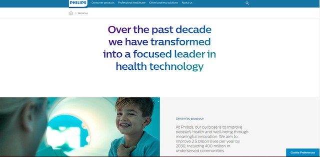Philips cũng tận dụng việc sử dụng nhiều trang để kể câu chuyện đầy đủ của họ, những trang chính của họ sử dụng các yếu tố hình ảnh đáng kinh ngạc để cho khách truy cập biết về nguồn gốc và niềm tin của công ty. Nó không quá nặng về văn bản, chỉ đánh vào các sự kiện quan trọng và cung cấp liên kết đến các trang có nhiều chi tiết hơn.