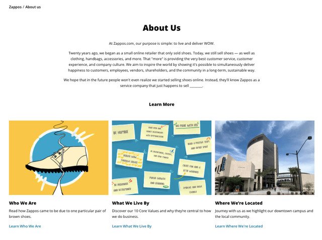 Zappos nổi tiếng với dịch vụ khách hàng và họ nêu bật điều đó trong hồ sơ của mình. Trang giới thiệu về công ty của họ kể một câu chuyện về dịch vụ và sự phát triển, tất cả đều tập trung vào khách hàng của họ.